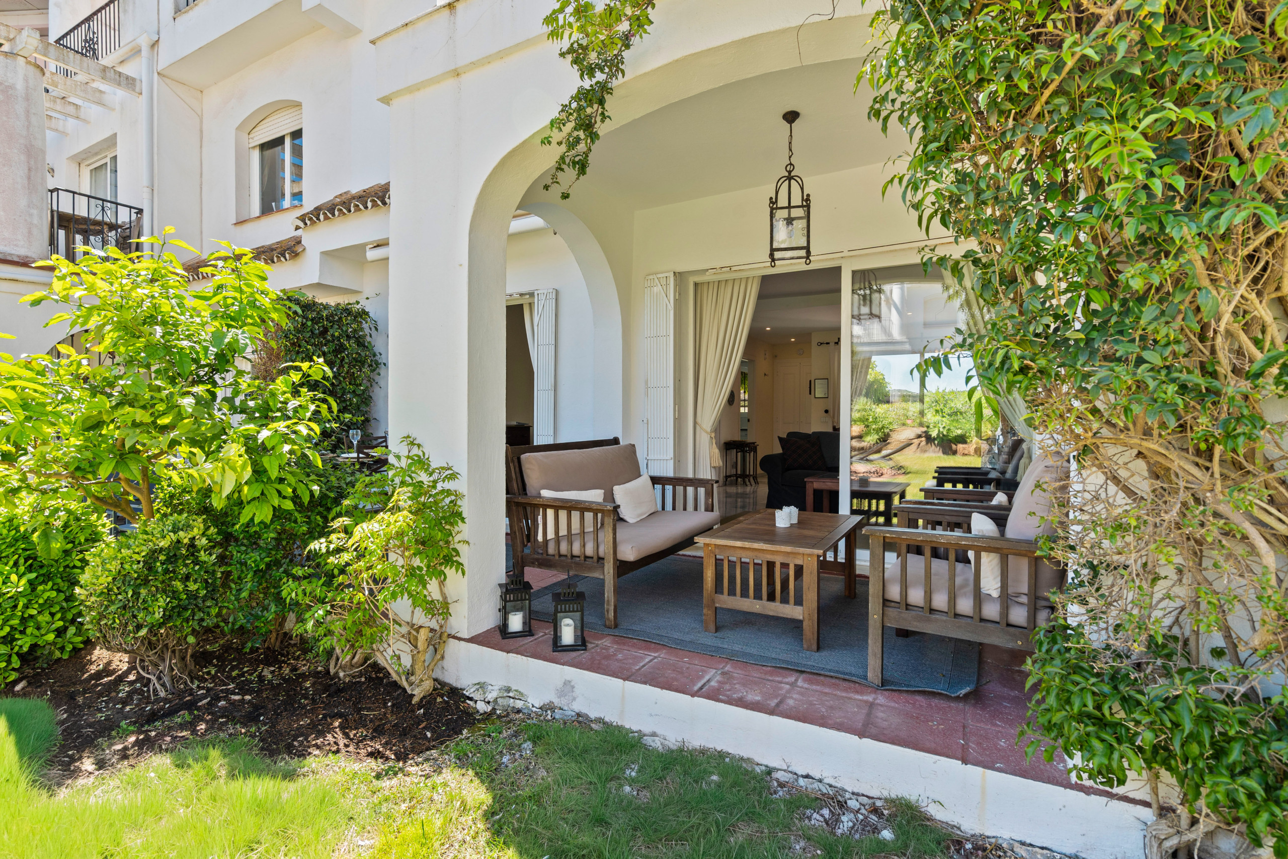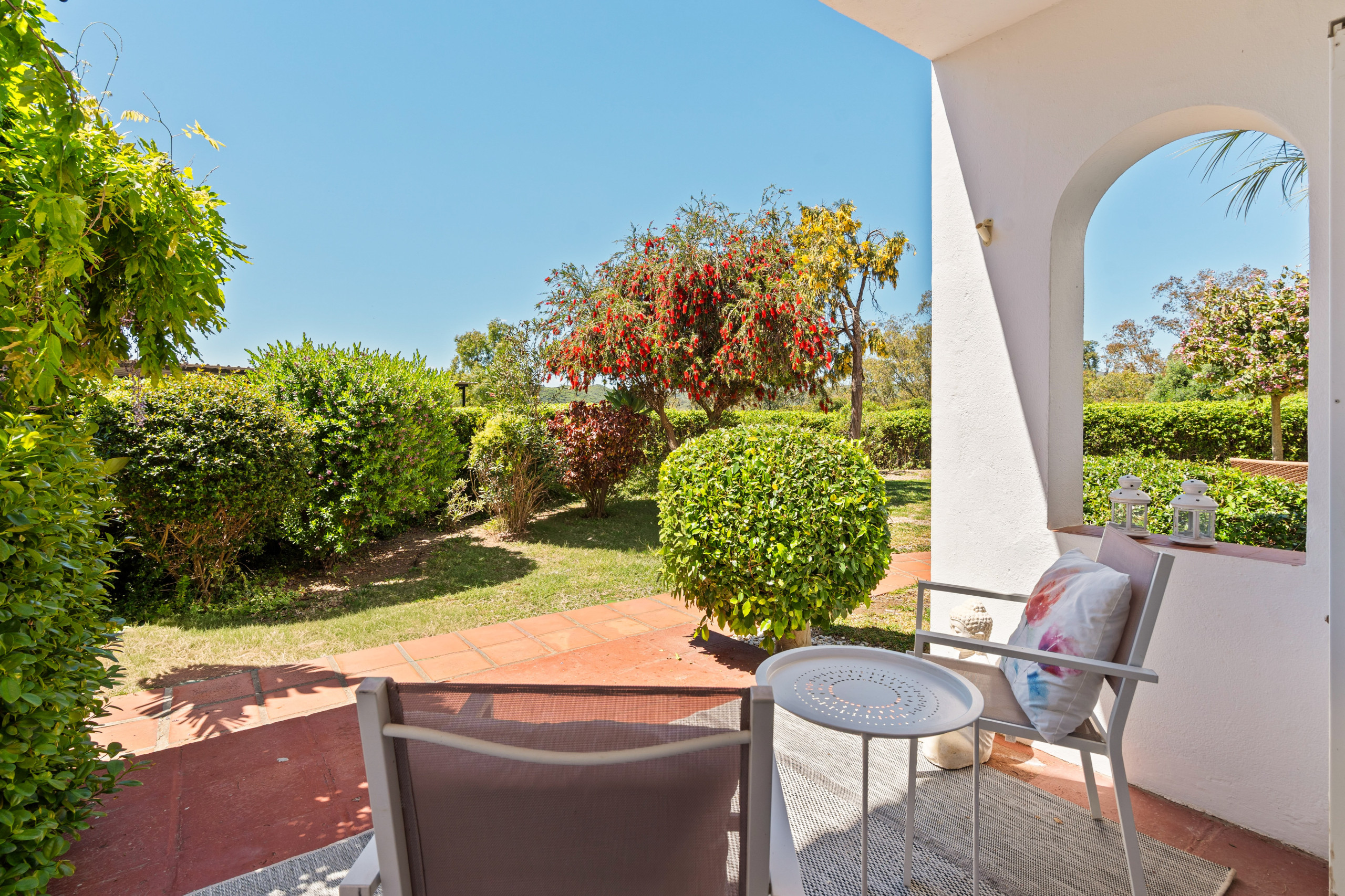 En la planta baja hay una cocina más pequeña pero totalmente equipada y un salón luminoso. La vivienda dispone de espacios exteriores a ambos lados, lo que permite disfrutar del sol o de la sombra durante todo el día.