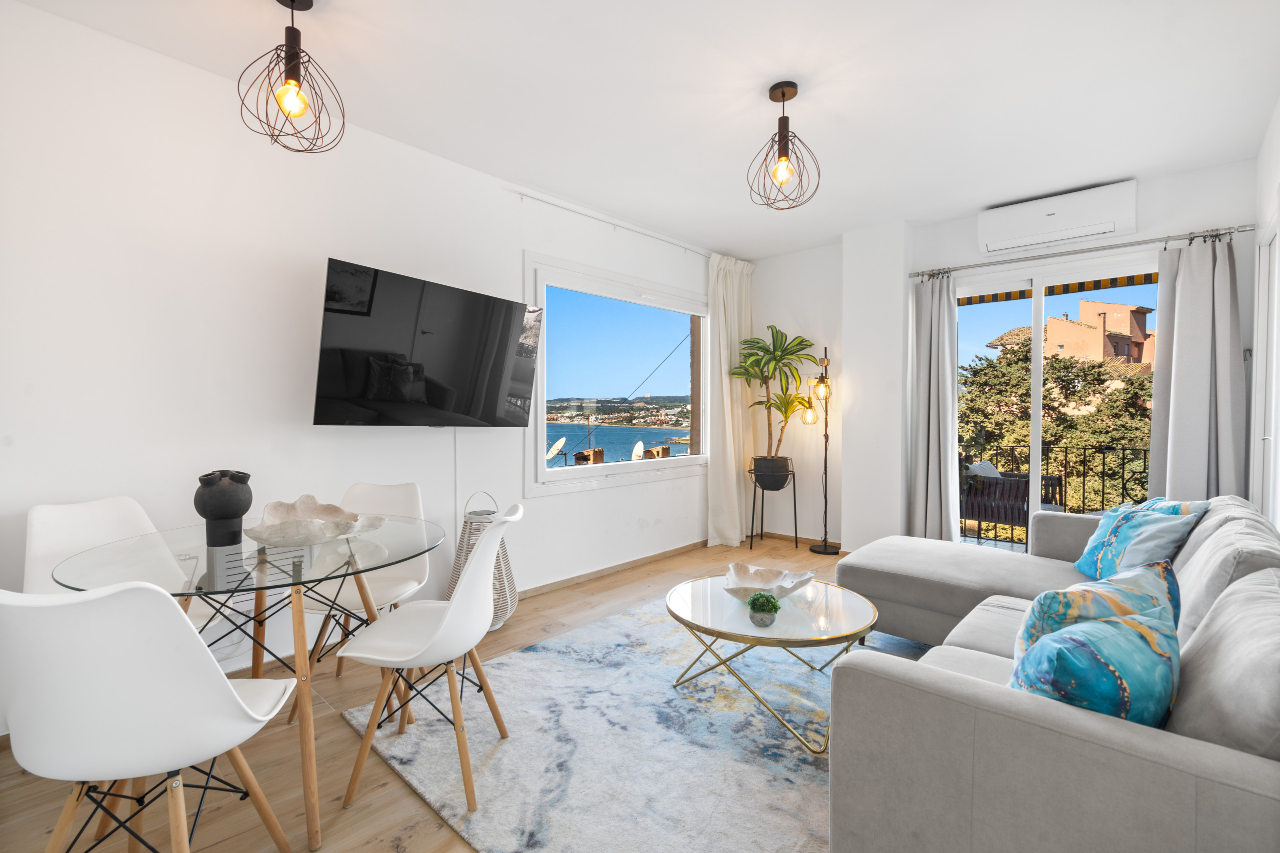 From the living room, you have a beautiful view of the Mediterranean, which gives the room a lovely light and a sense of proximity to the sea. The apartment also has a balcony where you can sit outside and enjoy the fresh sea breeze.