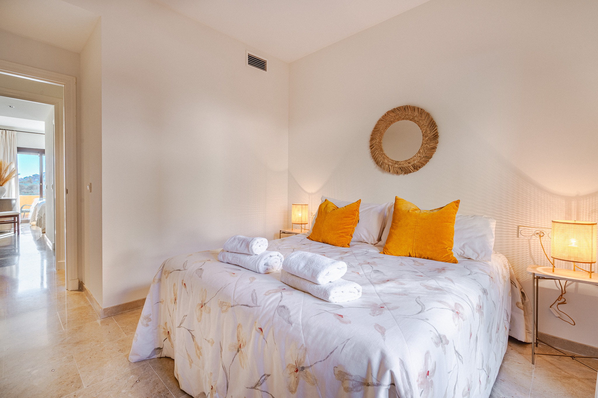 Outside the door are extra delights: free paddle tennis across the street, a large communal pool with sea and golf views, and sun loungers - perfect for lazy days in the sun.