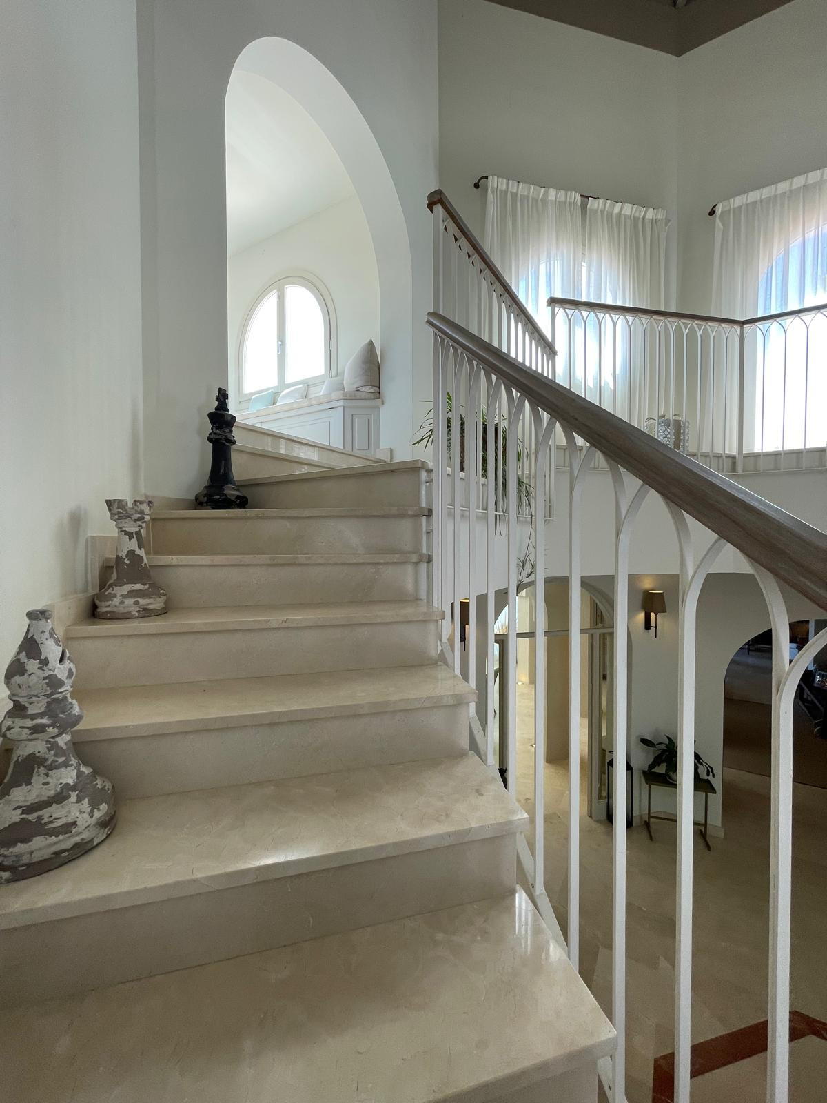 Spread over three elegant levels on a gently sloping hill, this villa offers breathtaking views of lush green fields. Its architecture and interiors blend seamlessly with the natural surroundings, combining timeless elegance with organic charm. Exposed wooden beams add a rustic touch, while classic and natural materials create inviting spaces that feel both luxurious and grounded.