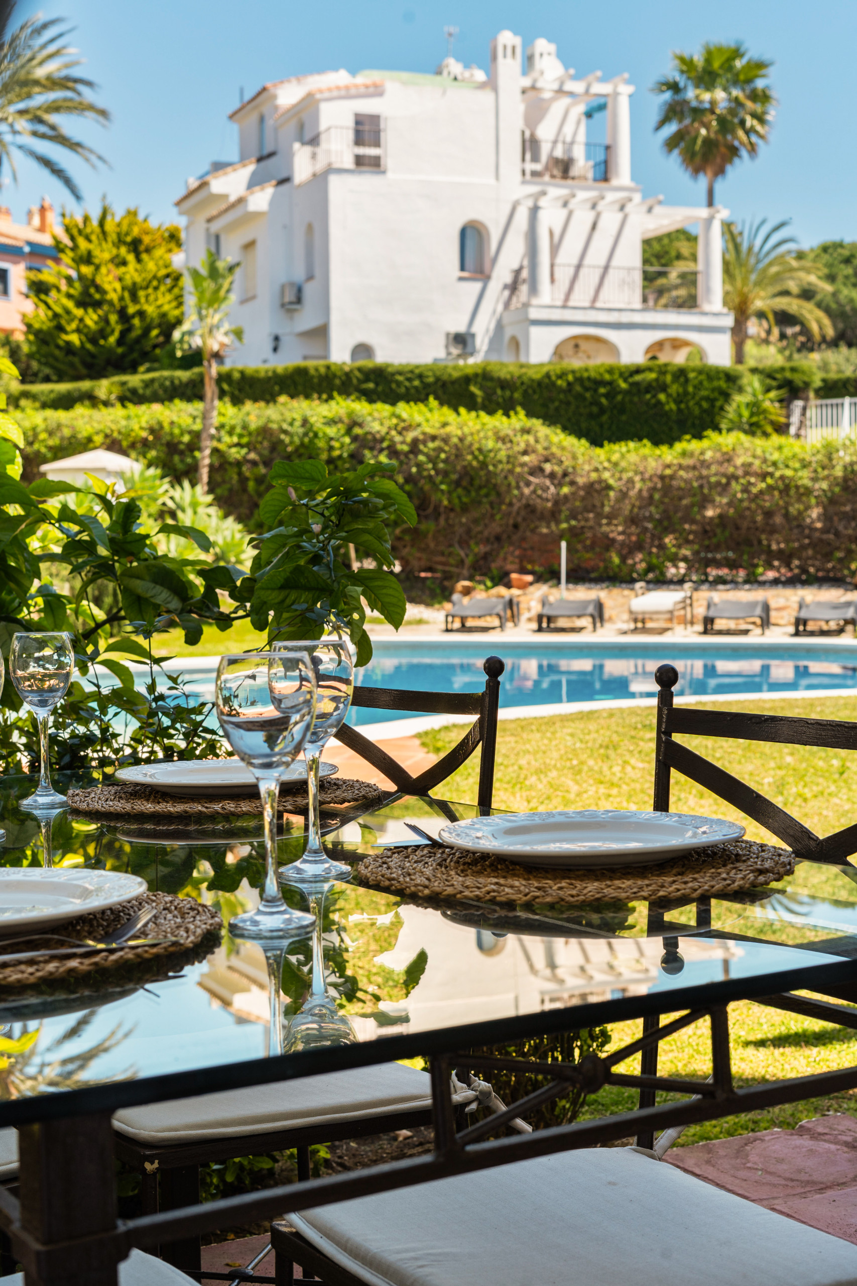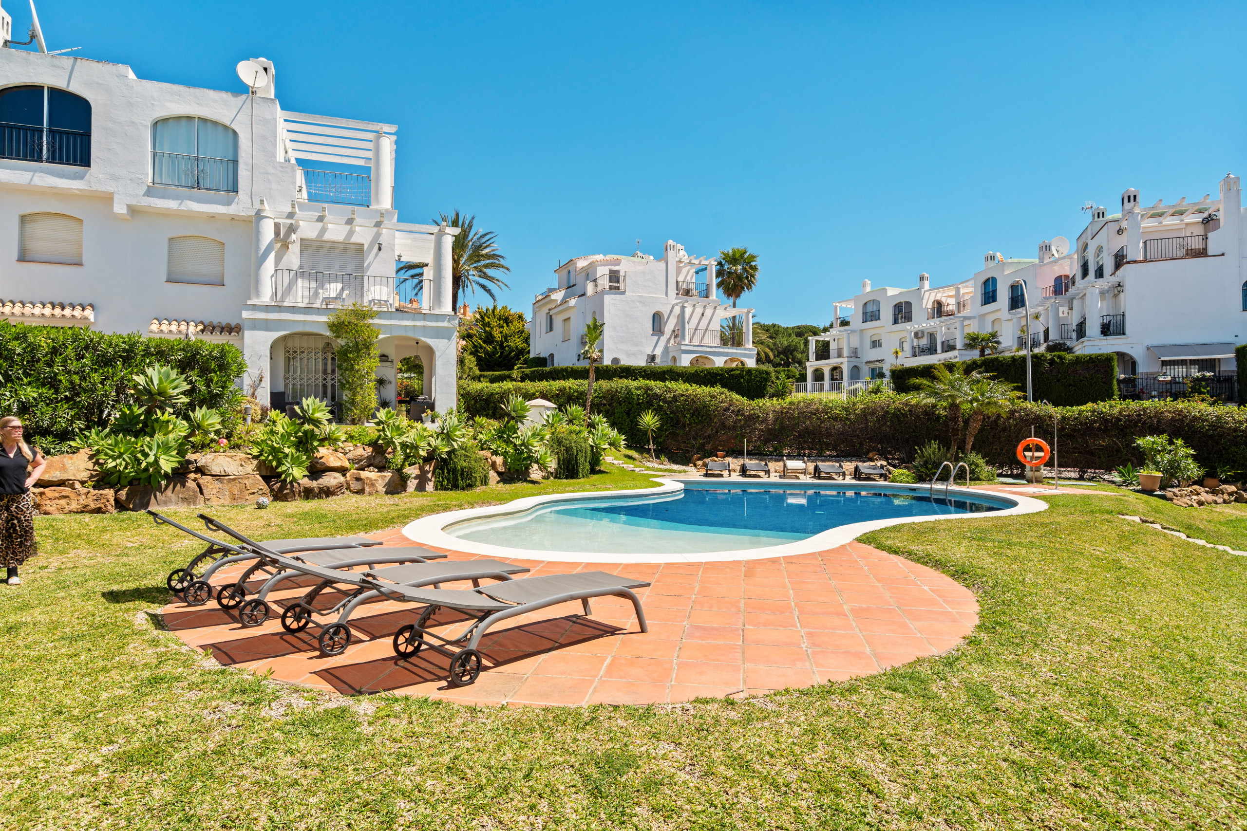 Den gemensamma poolen ligger nära bostaden och erbjuder en rofylld miljö.