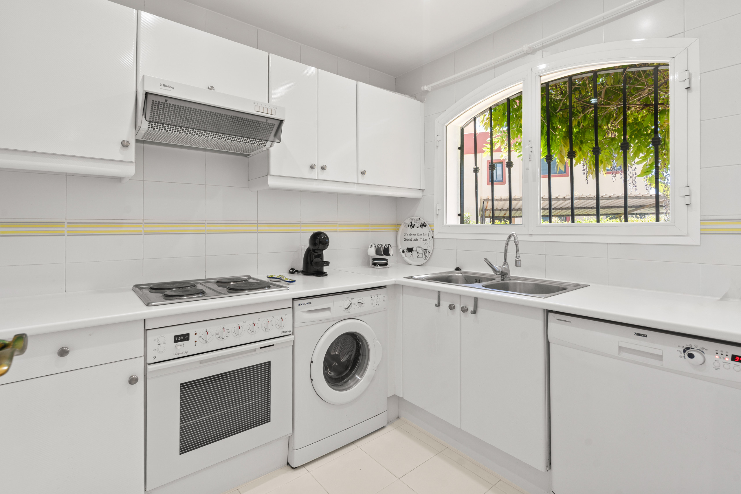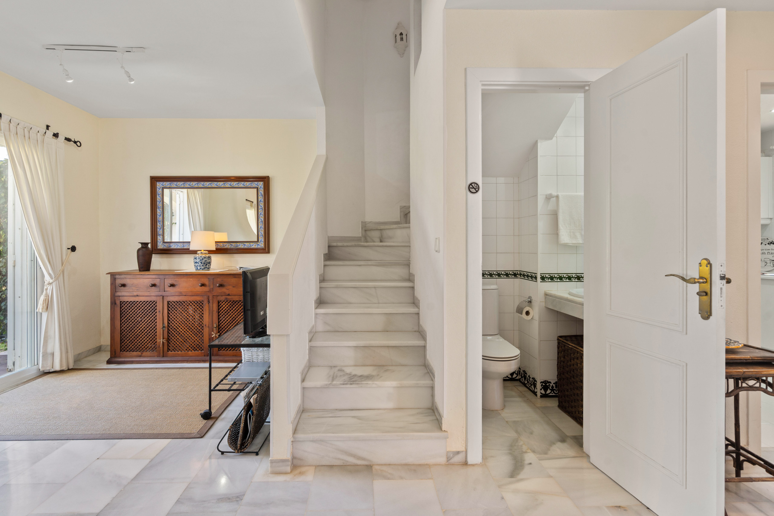 På entréplan finns ett mindre, fullt utrustat kök samt ett ljust vardagsrum. Härifrån når du uteplatser på båda sidor av huset – perfekt för att njuta av både sol och skugga under hela dagen.